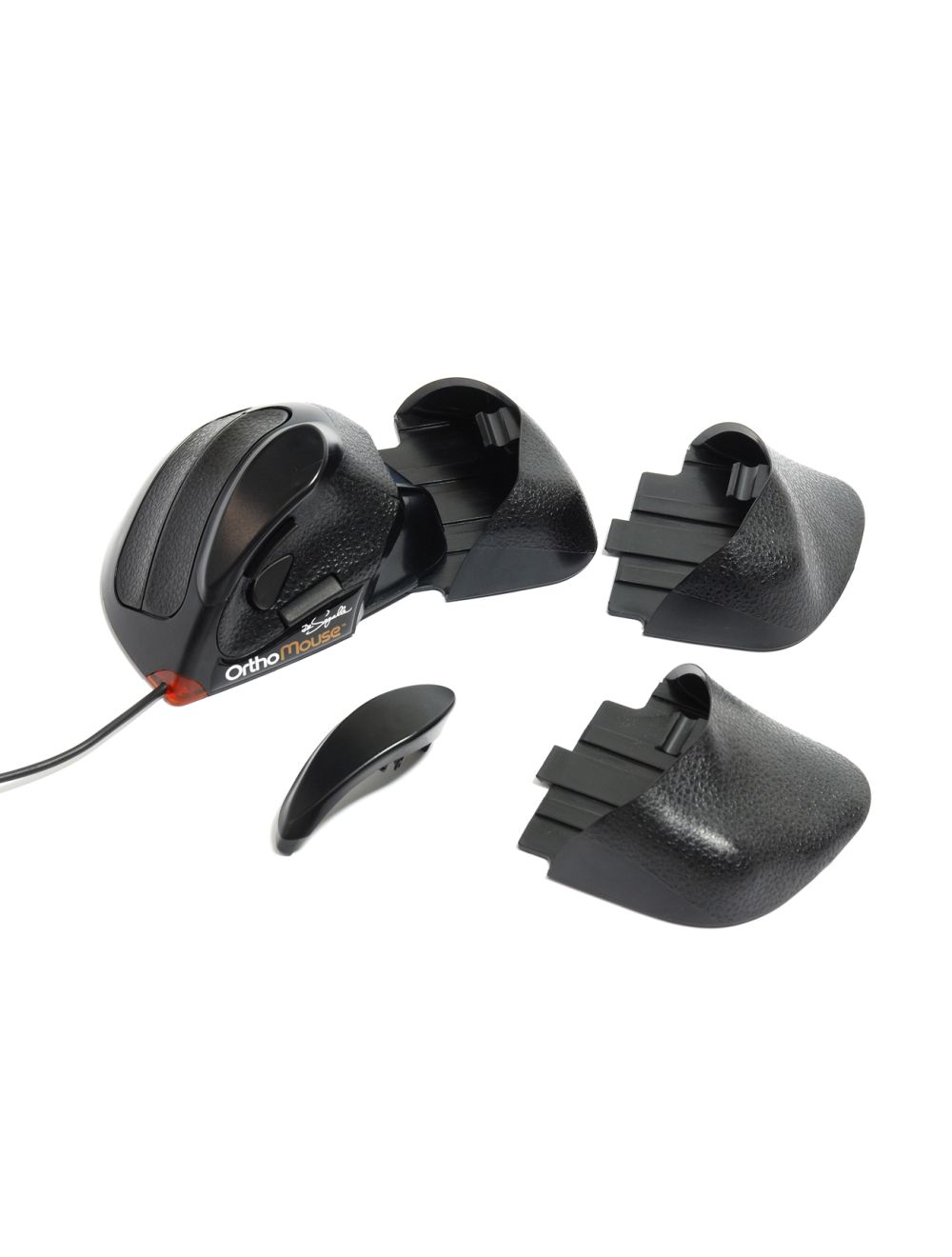- Adaptadores de mano incluídos. El OrthoMouse se adapta al tamaño y a la función de una mano media, lo que significa que se suministran 3 adaptadores fácilmente intercambiables para la palma de la mano y 2 adaptadores superiores previstos como pautas para dedos largos o medios. Todos los adaptadores están incluidos en el paquete.
